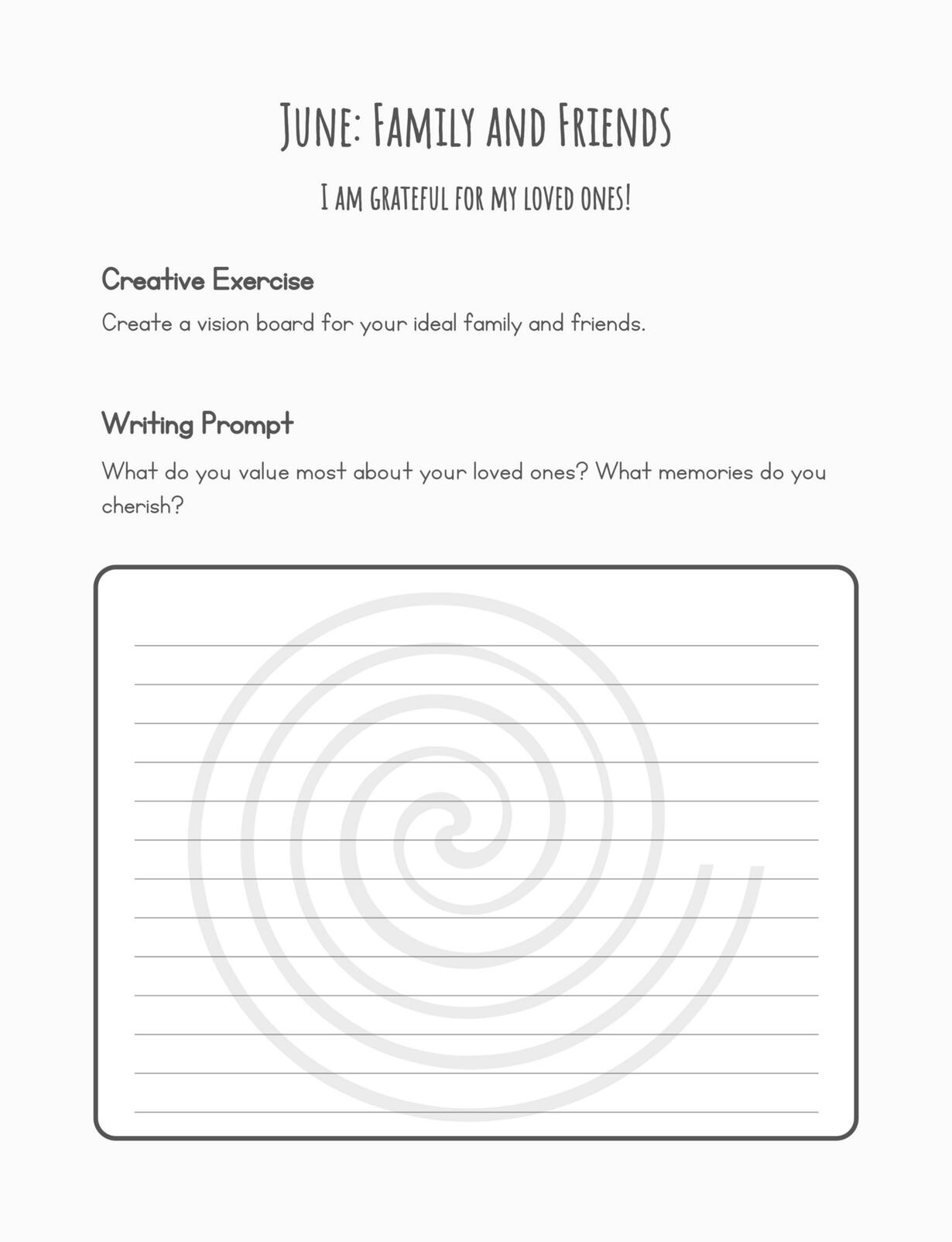 Below is a recording of our June ‘24 Workshop as an example. You'll also see a pic of our themed Workbook page. Print it off and watch the meditation, let me know what opens up for you.Our theme for June was Friends and Family